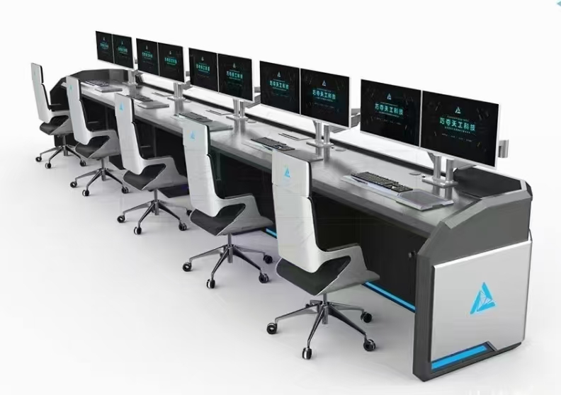 7、屏風(fēng):顯示器后屏風(fēng)采用工業(yè)拉鋁型材,表面黑色噴涂處理,凹槽可懸掛顯示器支架;后屏風(fēng)頂端鑲嵌亞克力及發(fā)光燈帶,鋁型材橫截面尺寸是根據(jù)此款式控制臺(tái)架構(gòu)特殊制定制,可安裝特制的LCD支架、工作燈、電話架、文件架等,以明確坐席功能及提升整體形象。